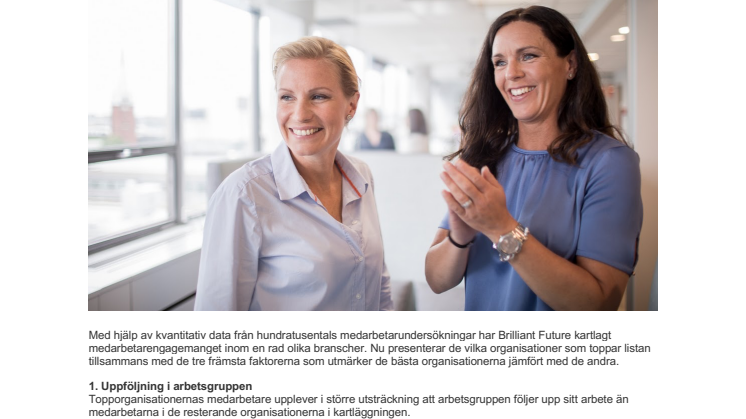 - Våra löpande analyser visar att engagerade medarbetare skapar lojala kunder och stärker affären. De organisationer som toppar listan med flest engagerade medarbetare visar vägen genom att satsa på energi, tydlighet och ledarskap vilket ökar möjligheterna för varje medarbetare att frigöra sin potential. Tillsammans visar de vikten av att kontinuerligt kartlägga medarbetarengagemanget i organisationen för att få ett kvitto på hur organisationen ligger till, säger Andreas Ferm, vd på Brilliant Future.
