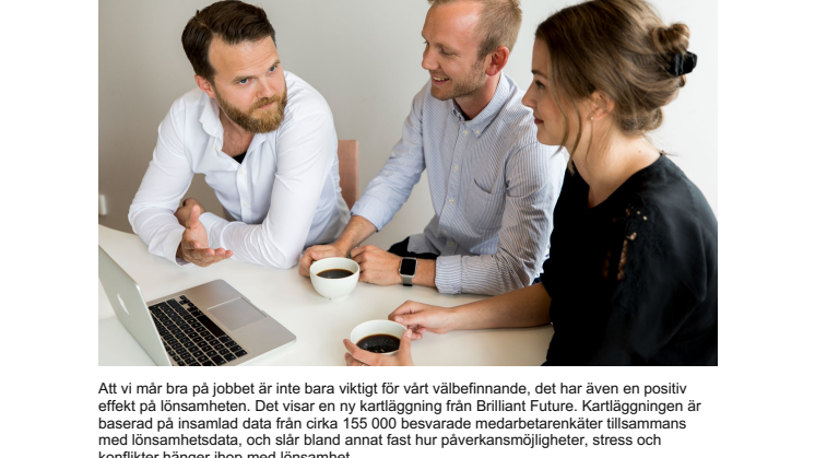 Att vi mår bra på jobbet är inte bara viktigt för vårt välbefinnande, det har även en positiv effekt på lönsamheten. Det visar en ny kartläggning från Brilliant Future. Kartläggningen är baserad på insamlad data från cirka 155 000 besvarade medarbetarenkäter tillsammans med lönsamhetsdata, och slår bland annat fast hur påverkansmöjligheter, stress och konflikter hänger ihop med lönsamhet.