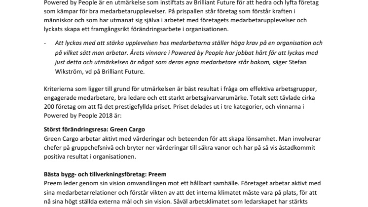 Kriterierna som ligger till grund för utmärkelsen är bäst resultat i fråga om effektiva arbetsgrupper, engagerade medarbetare, bra ledare och ett starkt arbetsgivarvarumärke. Totalt sett tävlade cirka 200 företag om att få det prestigefyllda priset. Priset delades ut i tre kategorier, och vinnarna i Powered by People 2018 är: