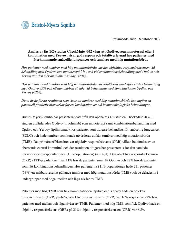 Analys av fas 1/2-studien CheckMate -032 visar att Opdivo, som monoterapi eller i kombination med Yervoy, visar god respons och totalöverlevnad hos patienter med återkommande småcellig lungcancer och tumörer med hög mutationsbörda