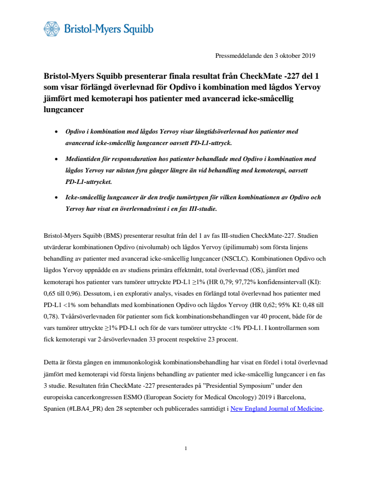 Bristol-Myers Squibb presenterar finala resultat från CheckMate -227 del 1 som visar förlängd överlevnad för Opdivo i kombination med lågdos Yervoy jämfört med kemoterapi hos patienter med avancerad icke-småcellig lungcancer