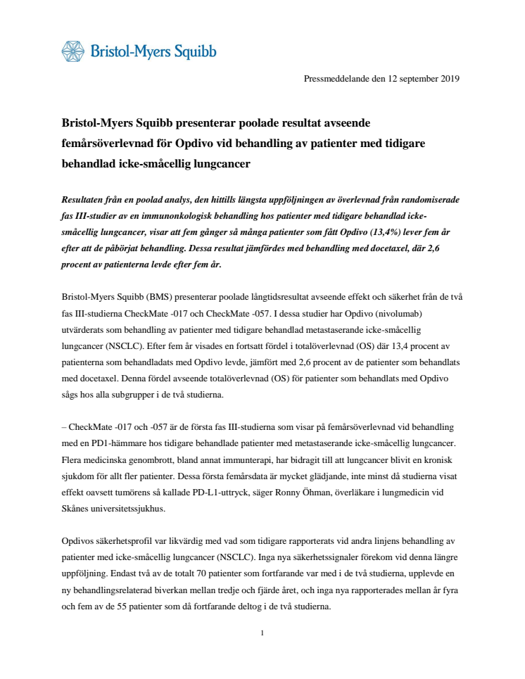 Bristol-Myers Squibb presenterar poolade resultat avseende femårsöverlevnad för Opdivo vid behandling av patienter med tidigare behandlad icke-småcellig lungcancer