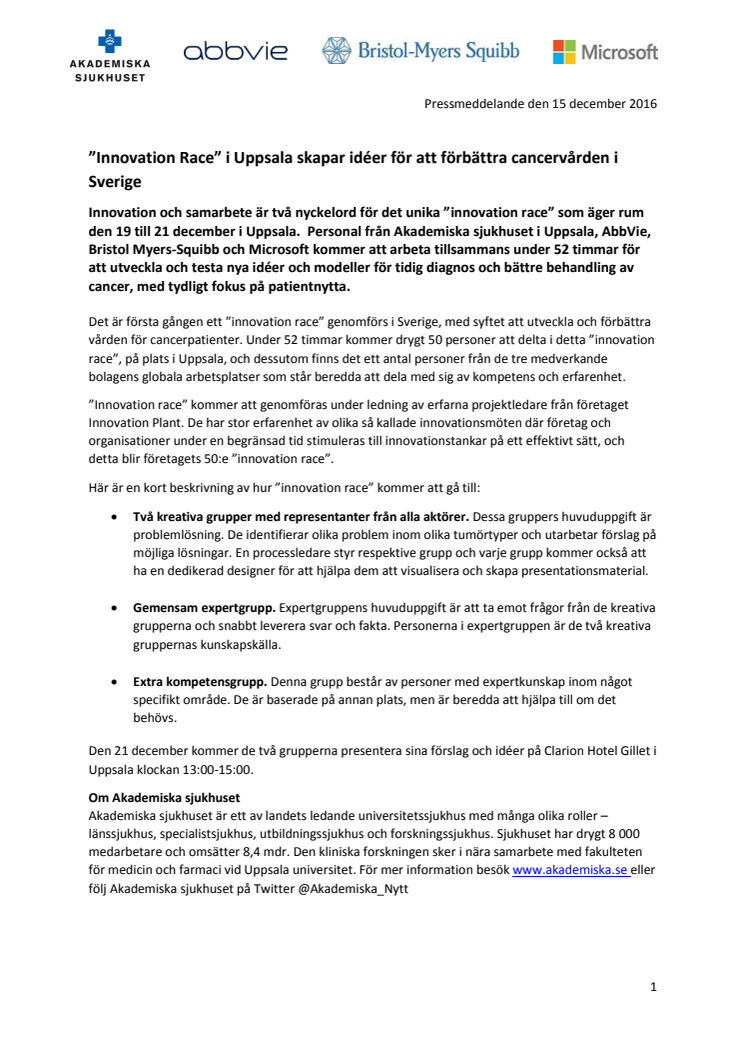 Innovation och samarbete är två nyckelord för det unika ”innovation race” som äger rum den 19 till 21 december i Uppsala.Personal från Akademiska sjukhuset i Uppsala, AbbVie, Bristol Myers-Squibb och Microsoft kommer att arbeta tillsammans under 52 timmar för att utveckla och testa nya idéer och modeller för tidig diagnos och bättre behandling av cancer, med tydligt fokus på patientnytta.