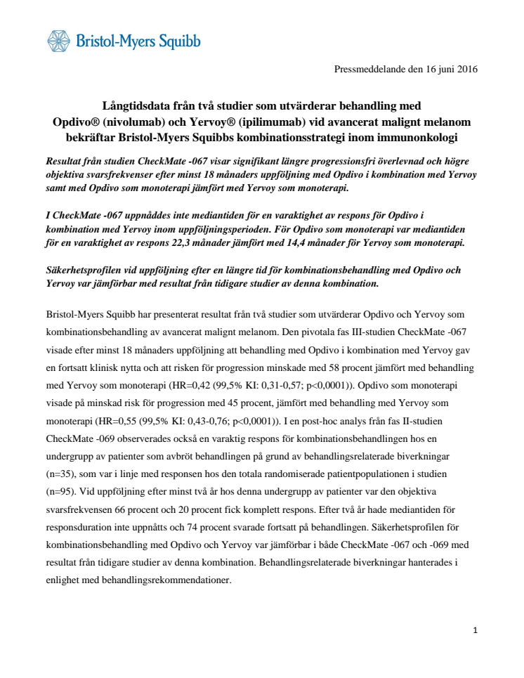 Långtidsdata från två studier som utvärderar behandling med Opdivo® (nivolumab) och Yervoy® (ipilimumab) vid avancerat malignt melanom bekräftar Bristol-Myers Squibbs kombinationsstrategi inom immunonkologi
