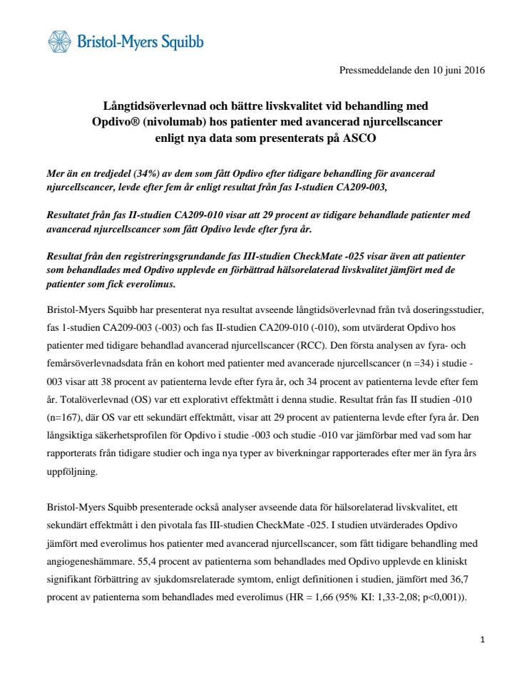 Långtidsöverlevnad och bättre livskvalitet vid behandling med Opdivo® (nivolumab) hos patienter med avancerad njurcellscancer enligt nya data som presenterats på ASCO