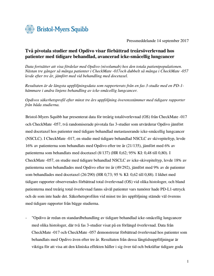 Två pivotala studier med Opdivo visar förbättrad treårsöverlevnad hos patienter med tidigare behandlad, avancerad icke-småcellig lungcancer