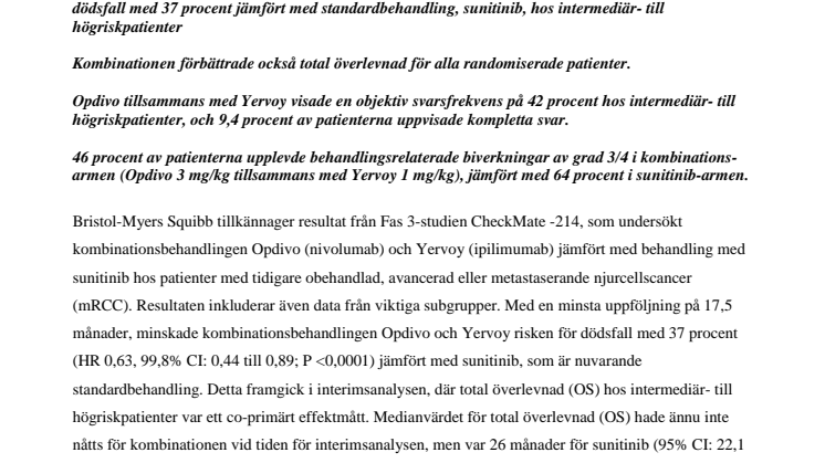 Bristol-Myers Squibb tillkännager resultat från Fas 3-studien CheckMate -214, som undersökt kombinationsbehandlingen Opdivo (nivolumab) och Yervoy (ipilimumab) jämfört med behandling med sunitinib hos patienter med tidigare obehandlad, avancerad eller metastaserande njurcellscancer (mRCC). Resultaten inkluderar även data från viktiga subgrupper. Med en minsta uppföljning på 17,5 månader, minskade kombinationsbehandlingen Opdivo och Yervoy risken för dödsfall med 37 procent (HR 0,63, 99,8% CI: 0,44 till 0,89; P <0,0001) jämfört med sunitinib, som är nuvarande standardbehandling. Detta framgick i interimsanalysen, där total överlevnad (OS) hos intermediär- till högriskpatienter var ett co-primärt effektmått. Medianvärdet för total överlevnad (OS) hade ännu inte nåtts för kombinationen vid tiden för interimsanalysen, men var 26 månader för sunitinib (95% CI: 22,1 till NA). Resultaten från CheckMate -214 presenterades vid Presidentens symposium II under den årliga europeiska cancerkongressen ESMO (European Society for Medical Oncology) 2017 i Madrid, Spanien (Abstract # LBA5).