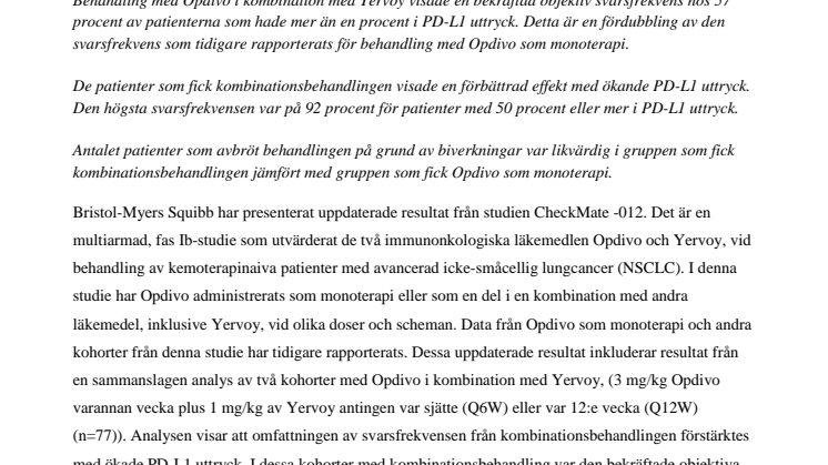 Bristol-Myers Squibb har presenterat uppdaterade resultat från studien CheckMate -012. Det är en multiarmad, fas Ib-studie som utvärderat de två immunonkologiska läkemedlen Opdivo och Yervoy, vid behandling av kemoterapinaiva patienter med avancerad icke-småcellig lungcancer (NSCLC). I denna studie har Opdivo administrerats som monoterapi eller som en del i en kombination med andra läkemedel, inklusive Yervoy, vid olika doser och scheman. Data från Opdivo som monoterapi och andra kohorter från denna studie har tidigare rapporterats. Dessa uppdaterade resultat inkluderar resultat från en sammanslagen analys av två kohorter med Opdivo i kombination med Yervoy, (3 mg/kg Opdivo varannan vecka plus 1 mg/kg av Yervoy antingen var sjätte (Q6W) eller var 12:e vecka (Q12W) (n=77)). Analysen visar att omfattningen av svarsfrekvensen från kombinationsbehandlingen förstärktes med ökade PD-L1 uttryck. I dessa kohorter med kombinationsbehandling var den bekräftade objektiva svarsfrekvensen (ORR) hos patienter med ≥1 procent PD-L1 uttryck 57 procent och bekräftade ORR var 92 procent (n=12/13) hos patienter med ≥50 procent PD-L1 uttryck. ORR i den totala populationen var 47 procent och 39 procent för Q12W respektive Q6W. Behandlingsrelaterade biverkningar som rapporterades, grad 3-4, var 37 procent för Q12W, 33 procent för Q6W och 19 procent för Opdivo monoterapikohorten. Behandlingsrelaterade biverkningar som ledde till att behandlingen avbröts rapporterade hos fem, åtta och tio procent av patienterna i Q12W, Q6W respektive Opdivo monoterapigruppen. Det rapporterades inga behandlingsrelaterade dödsfall.