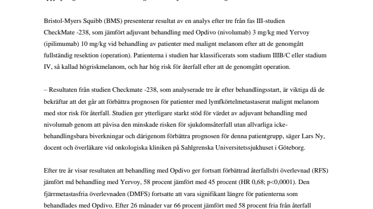 Bristol-Myers Squibb (BMS) presenterar resultat av en analys efter tre från fas III-studien