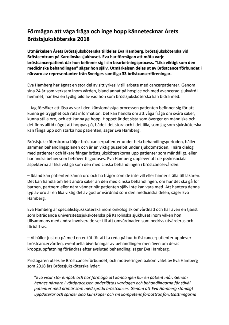Utmärkelsen Årets Bröstsjuksköterska tilldelas Eva Hamberg, bröstsjuksköterska vid Bröstcentrum på Karolinska sjukhuset. Eva har förmågan att möta varje bröstcancerpatient där hon befinner sig i sin process. ”Lika viktigt som den medicinska behandlingen” säger hon själv. Utmärkelsen delas ut av Bröstcancerförbundet i närvaro av representanter från Sveriges samtliga bröstcancerföreningar.