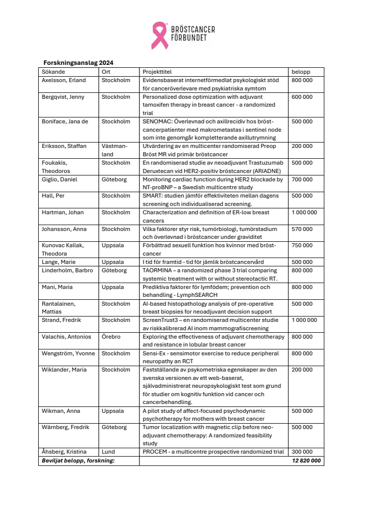 Bröstcancerförbundet delar ut 14,5 miljoner kronor till patientnära bröstcancerforskning. Läs mer om forskarna och anslagna projekt i detta dokument.