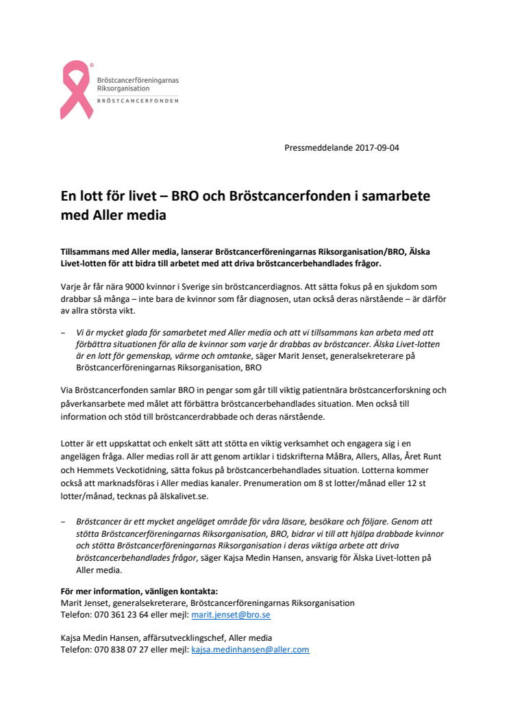 En lott för livet – BRO och Bröstcancerfonden i samarbete med Aller media