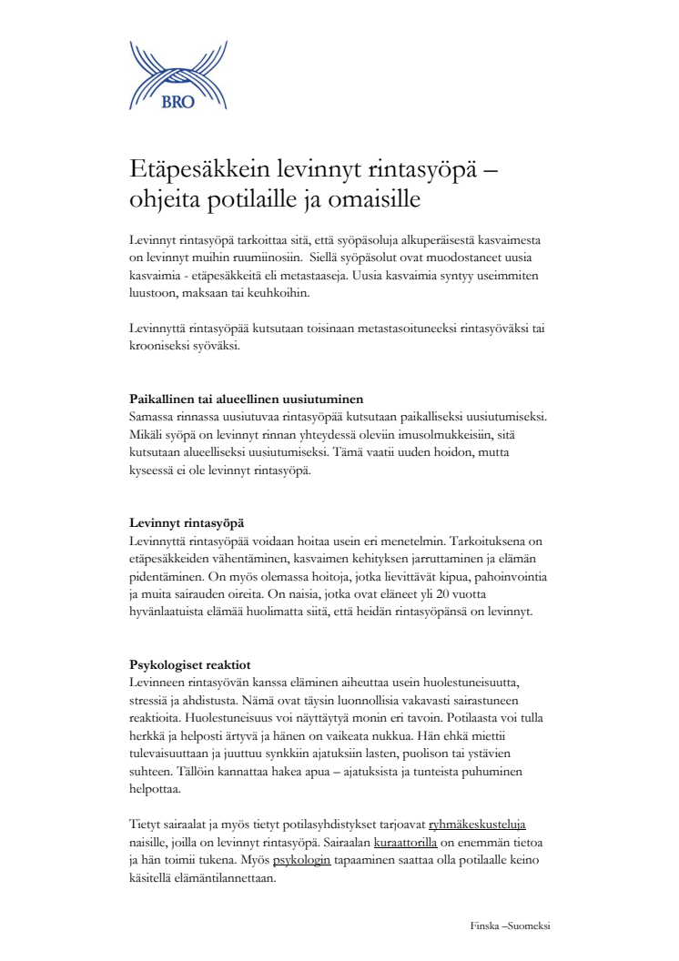 Etäpesäkkein levinnyt rintasyöpä – ohjeita potilaille ja omaisille – Fakta om spridd bröstcancer på finska