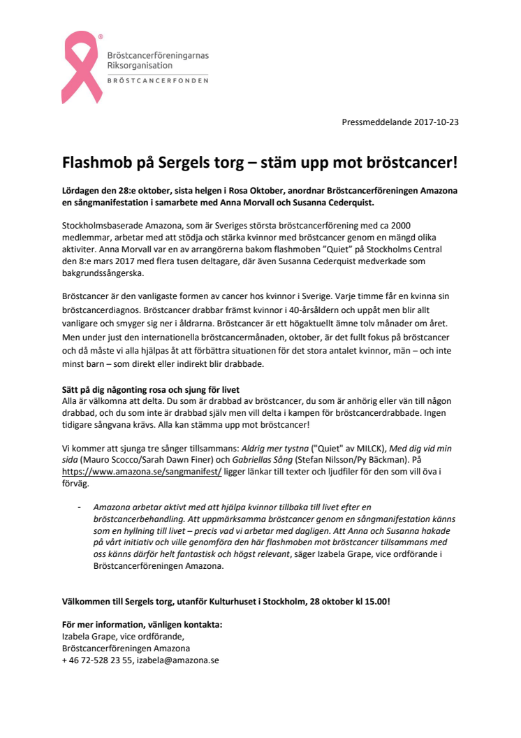 Lördagen den 28:e oktober, sista helgen i Rosa Oktober, anordnar Bröstcancerföreningen Amazona en sångmanifestation i samarbete med Anna Morvall och Susanna Cederquist. Välkommen till Sergels torg, utanför Kulturhuset i Stockholm, 28 oktober kl 15.00. Sätt på dig någonting rosa och sjung för livet!