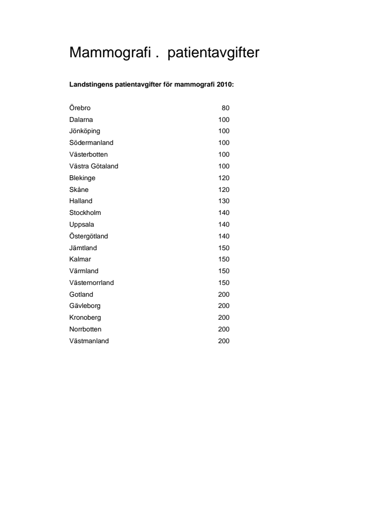 Landstingens patientavgifter för röntgenundersökning av bröst (mammografi) varierar från 80 till 200 kronor. Örebro har den lägsta patientavgiften, medan Gotland, Gävleborg, Kronoberg, Norrbotten och Västmanland ligger högst med 200 kronor.