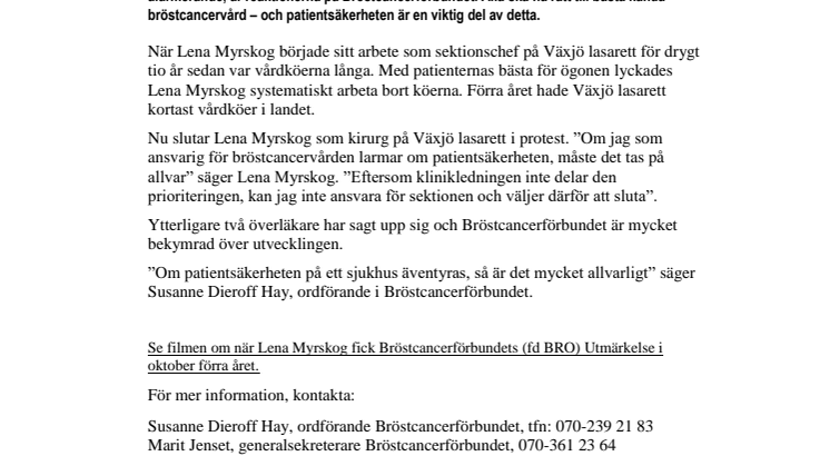 I höstas mottog överläkare och bröstkirurg Lena Myrskog Bröstcancerförbundets Utmärkelse för sitt arbete och engagemang för bröstcancerdrabbade kvinnor. Nu säger hon upp sig som en konsekvens av bristande patientsäkerhet på Växjö lasarett. Ytterst alarmerande, är reaktionerna på Bröstcancerförbundet. Alla ska ha rätt till bästa kända bröstcancervård. Patientsäkerheten är en viktig del av detta.