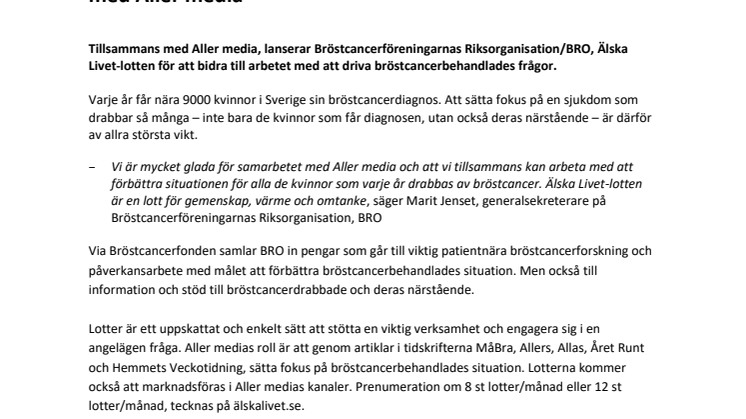 - Vi är mycket glada för samarbetet med Aller media och att vi tillsammans kan arbeta med att förbättra situationen för alla de kvinnor som varje år drabbas av bröstcancer. Älska Livet-lotten är en lott för gemenskap, värme och omtanke, säger Marit Jenset, generalsekreterare på Bröstcancerföreningarnas Riksorganisation, BRO