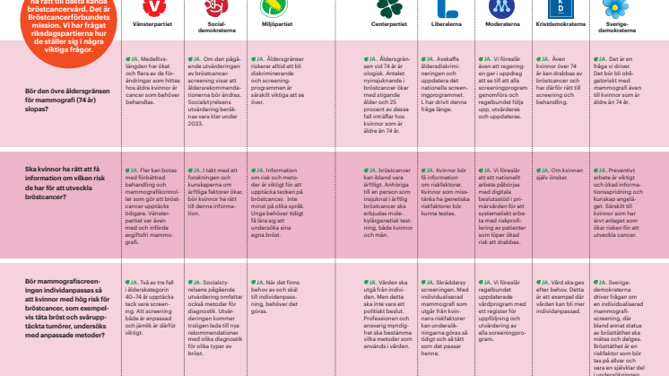 Bröstcancerförbundet har inför valet i september frågat partierna i Sveriges riksdag vad de tycker om bröstcancervården. Samtliga partier ställer sig bakom behoven av ett individanpassat screeningprogram. Vad gäller frågan om tillgång till nya effektiva cancermediciner, där Sverige ligger efter andra europeiska länder är det endast Socialdemokraterna som är nöjda med dagens system för införande av nya läkemedel. Undersökningen presenteras i Bröstcancerförbundets medlemstidning Magasin B i juni 2022.
