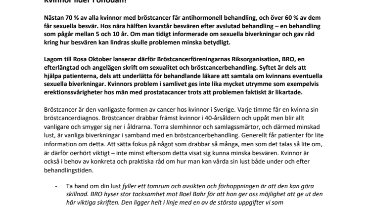Lagom till Rosa Oktober lanserar därför Bröstcancerföreningarnas Riksorganisation, BRO, en efterlängtad och angelägen skrift om sexualitet och bröstcancerbehandling. Syftet är dels att hjälpa patienterna, dels att underlätta för behandlande läkare att samtala om kvinnans eventuella sexuella biverkningar. Kvinnors problem i samlivet ges inte lika mycket utrymme som exempelvis erektionssvårigheter hos män med prostatacancer trots att problemen faktiskt är likartade.