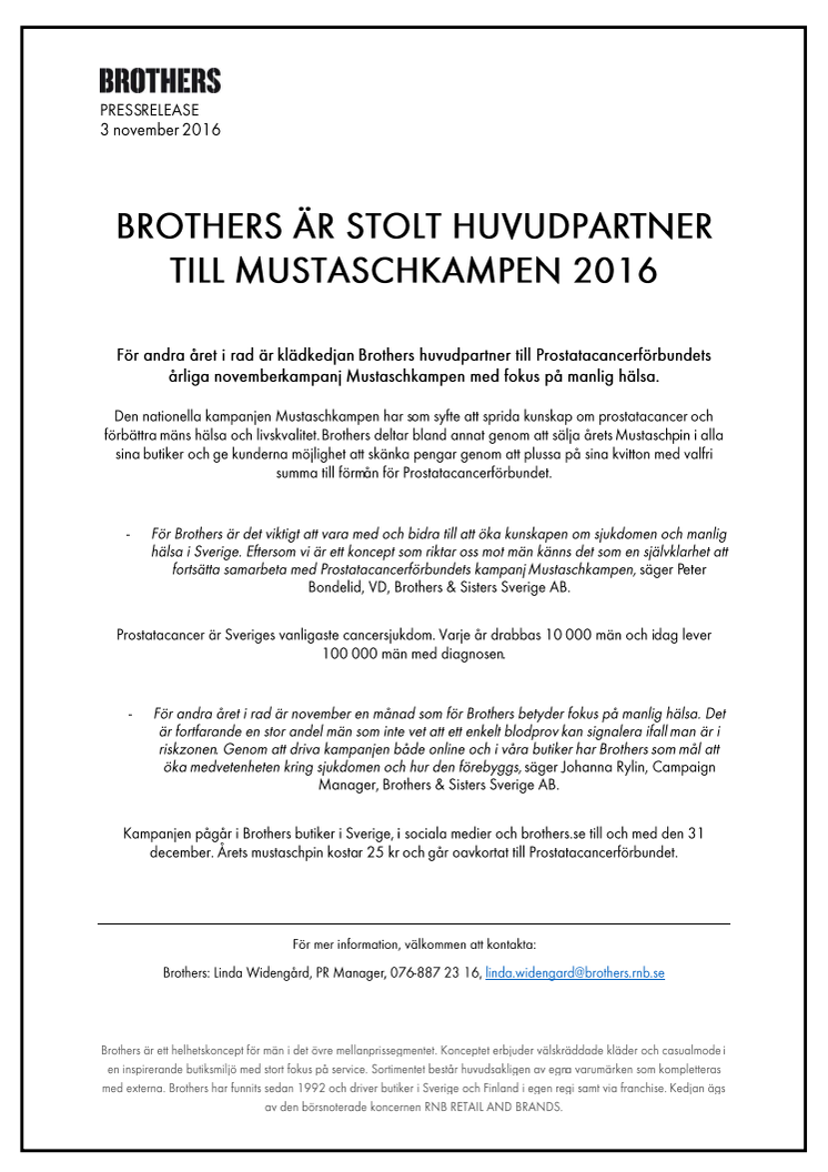 För andra året i rad är klädkedjan Brothers huvudpartner till Prostatacancerförbundets årliga novemberkampanj Mustaschkampen med fokus på manlig hälsa.