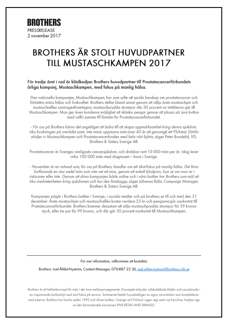 För tredje året i rad är klädkedjan Brothers huvudpartner till Prostatacancerförbundets årliga kampanj, Mustaschkampen, med fokus på manlig hälsa.