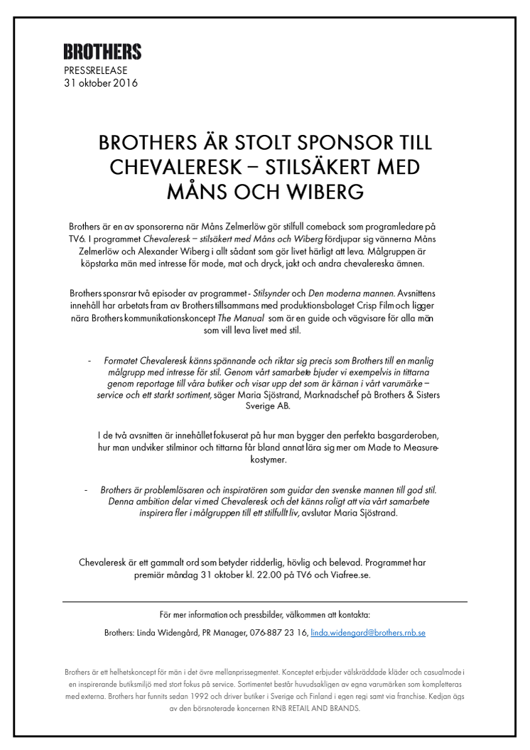Brothers är en av sponsorerna när Måns Zelmerlöw gör stilfull comeback som programledare på TV6. I programmet Chevaleresk – stilsäkert med Måns och Wiberg fördjupar sig vännerna Måns Zelmerlöw och Alexander Wiberg i allt sådant som gör livet härligt att leva. Målgrupp är köpstarka män med intresse för mode, mat och dryck, jakt och andra chevalereska ämnen.