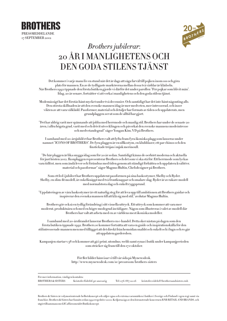 När Brothers 1992 öppnade den första butiken gjorde vi därför det under parollen ”För pojkar som blivit män”. Idag, 20 år senare, fortsätter vi att verka i manlighetens och den goda stilens tjänst.