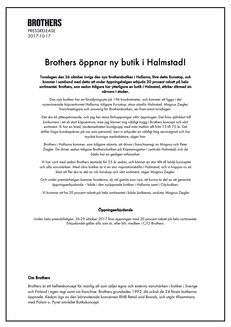 Torsdagen den 26 oktober invigs den nya Brothersbutiken i Hallarna, före detta Eurostop, och kommer i samband med detta att under öppningshelgen erbjuda 20 procent rabatt på hela sortimentet. Brothers, som sedan tidigare har ytterligare en butik i Halmstad, stärker därmed sin närvaro i staden.