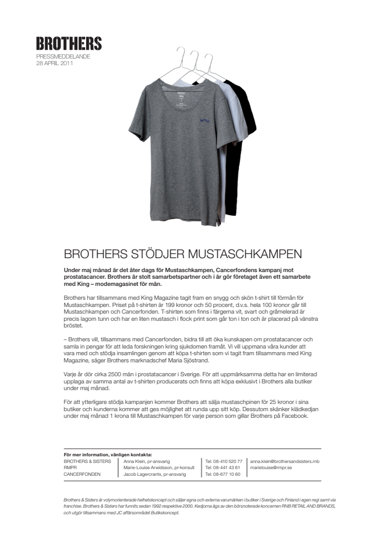 Under maj månad är det åter dags för Mustaschkampen, Cancerfondens kampanj mot prostatacancer. Brothers är stolt samarbetspartner och i år gör företaget även ett samarbete med modemagasinet King.