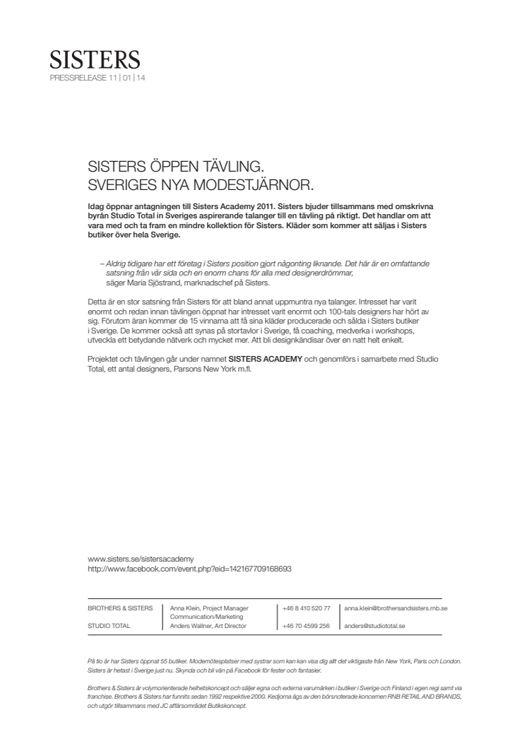 Idag öppnar antagningen till Sisters Academy 2011. Sisters bjuder tillsammans med omskrivna byrån Studio Total in Sveriges aspirerande talanger till en tävling på riktigt. Det handlar om att vara med och ta fram en mindre kollektion för Sisters. Kläder som kommer att säljas i Sisters butiker över hela Sverige.
