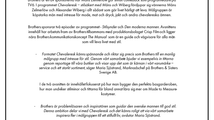 - Formatet Chevaleresk känns spännande och riktar sig precis som Brothers till en manlig målgrupp med intresse för stil. Genom vårt samarbete bjuder vi exempelvis in tittarna genom reportage till våra butiker och visar upp det som är kärnan i vårt varumärke – service och ett starkt sortiment, säger Maria Sjöstrand, Marknadschef på Brothers & Sisters Sverige AB.