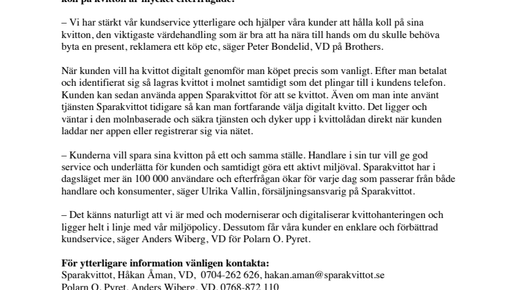 För ytterligare information vänligen kontakta: Sparakvittot, Håkan Åman, VD, 0704-262 626, hakan.aman@sparakvittot.se Polarn O. Pyret, Anders Wiberg, VD, 0768-872 110 Brothers, Peter Bondelid, VD, 0768-87 21 03