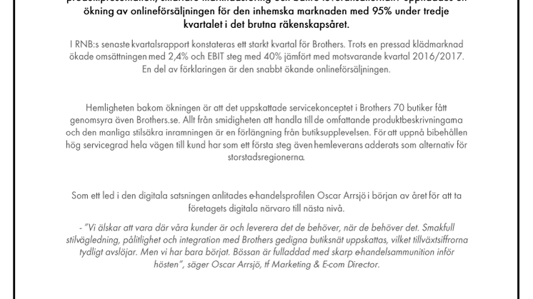 - ”Vi älskar att vara där våra kunder är och leverera det de behöver, när de behöver det. Smakfull stilvägledning, pålitlighet och integration med Brothers gedigna butiksnät uppskattas, vilket tillväxtsiffrorna tydligt avslöjar. Men vi har bara börjat. Bössan är fulladdad med skarp e-handelsammunition inför hösten”, säger Oscar Arrsjö, tf Marketing & E-com Director.