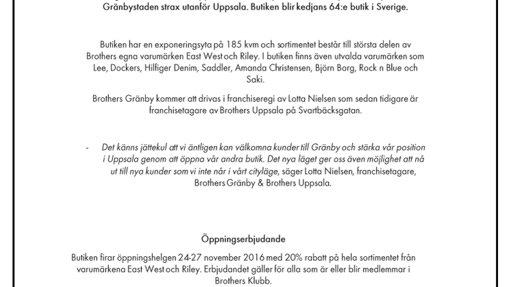 Torsdag den 24 november öppnar herrklädkedjan Brothers en ny butik i köpcentrumet Gränbystaden strax utanför Uppsala. Butiken blir kedjans 64:e butik i Sverige.