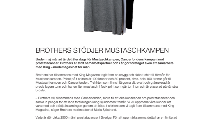 – Brothers vill, tillsammans med Cancerfonden, bidra till att öka kunskapen om prostatacancer och samla in pengar för att leda forskningen kring sjukdomen framåt. Vi vill uppmana våra kunder att vara med och stödja insamlingen genom att köpa t-shirten som vi tagit fram tillsammans med King Magazine, säger Brothers marknadschef Maria Sjöstrand.