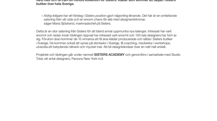 – Aldrig tidigare har ett företag i Sisters position gjort någonting liknande. Det här är en omfattande satsning från vår sida och en enorm chans för alla med designerdrömmar, säger Maria Sjöstrand, marknadschef på Sisters.