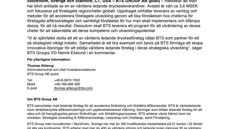 "We are pleased that this leading beverage company has chosen to partner with BTS on this important strategic initiative. The partnership is evidence supporting our differentiated capabilities in developing leaders and enabling effective execution," says Henrik Ekelund, President and CEO of BTS Group AB.