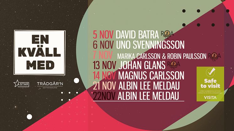 A Star Entertainment presenterar stolt ”En kväll med” på Trädgår’n i Göteborg som under sju kvällar i november kommer att gästas av flera av Sveriges främsta artister, såsom Albin Lee Meldau, Uno Svenningsson, Magnus Carlsson, Johan Glans, David Batra, Marika Carlsson och Robin Paulsson. Premiär den 5 november.