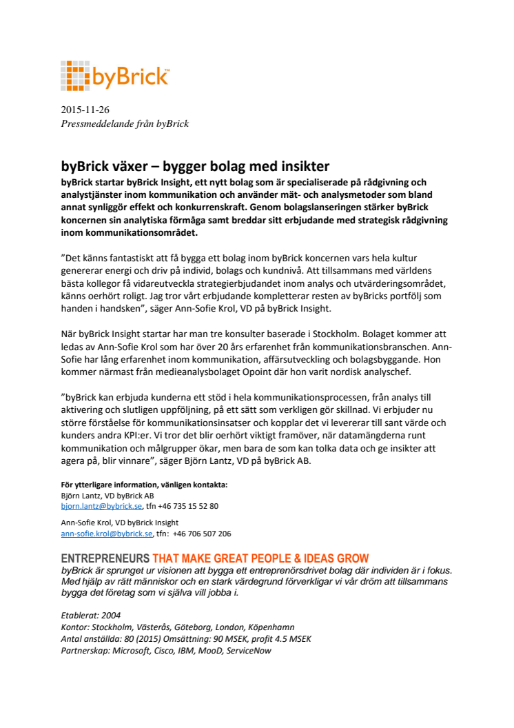 byBrick startar byBrick Insight, ett nytt bolag som är specialiserade på rådgivning och analystjänster inom kommunikation och använder mät- och analysmetoder som bland annat synliggör effekt och konkurrenskraft. Genom bolagslanseringen stärker byBrick koncernen sin analytiska förmåga samt breddar sitt erbjudande med strategisk rådgivning inom kommunikationsområdet.