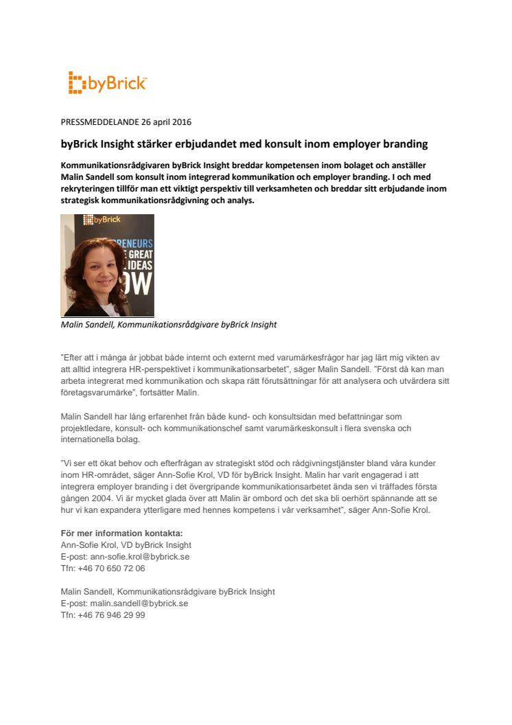 ”Vi ser ett ökat behov och efterfrågan av strategiskt stöd och rådgivningstjänster bland våra kunder inom HR-området, säger Ann-Sofie Krol, VD för byBrick Insight. Malin har varit engagerad i att integrera employer branding i det övergripande kommunikationsarbetet ända sen vi träffades första gången 2004. Vi är mycket glada över att Malin är ombord och det ska bli oerhört spännande att se hur vi kan expandera ytterligare med hennes kompetens i vår verksamhet”, säger Ann-Sofie Krol.