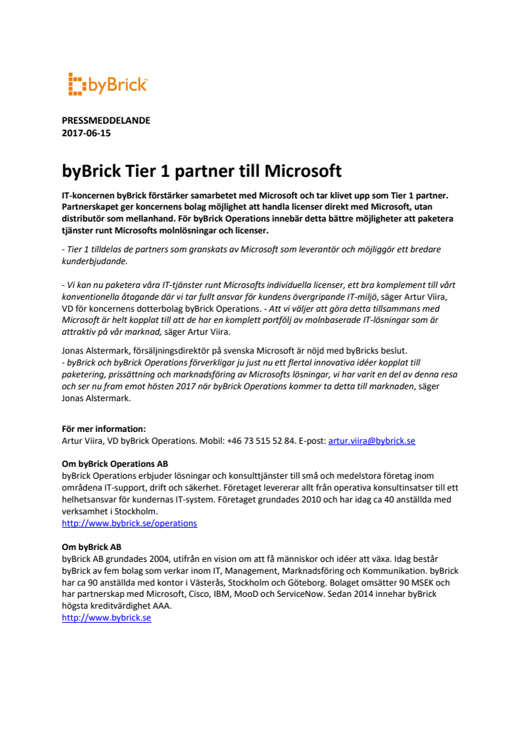 - Vi kan nu paketera våra IT-tjänster runt Microsofts individuella licenser, ett bra komplement till vårt konventionella åtagande där vi tar fullt ansvar för kundens övergripande IT-miljö, säger Artur Viira, VD för koncernens dotterbolag byBrick Operations. - Att vi väljer att göra detta tillsammans med Microsoft är helt kopplat till att de har en komplett portfölj av molnbaserade IT-lösningar som är attraktiv på vår marknad, säger Artur Viira.