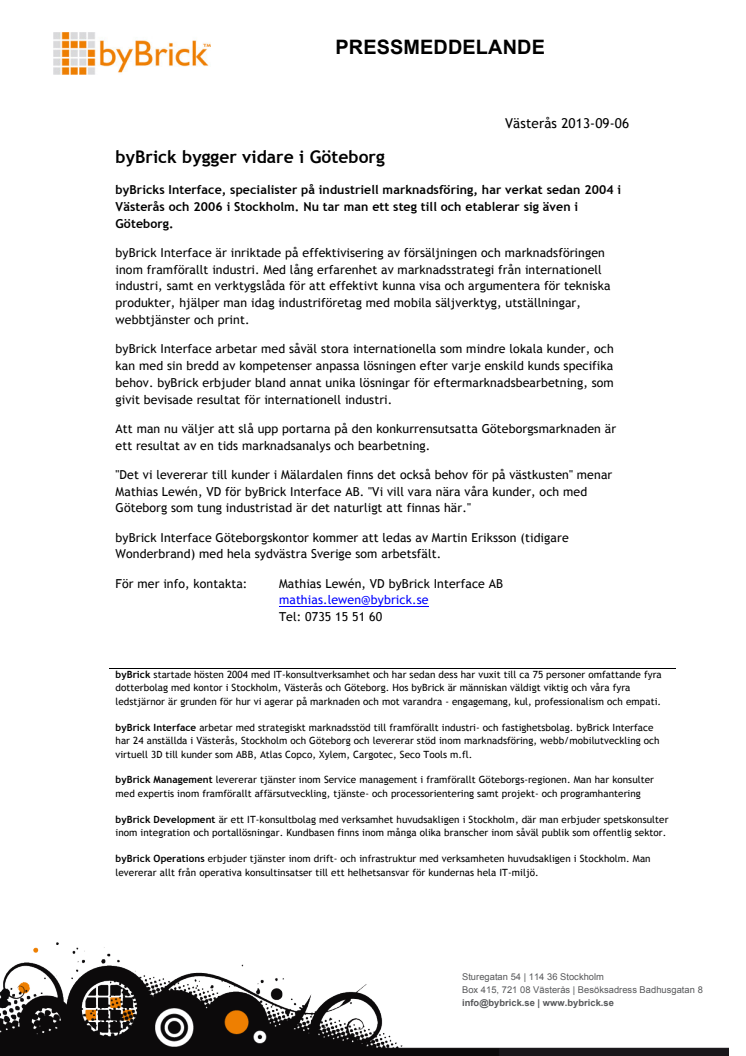 "Det vi levererar till kunder i Mälardalen finns det också behov för på västkusten" menar Mathias Lewén, VD för byBrick Interface AB. "Vi vill vara nära våra kunder, och med Göteborg som tung industristad är det naturligt att finnas här."