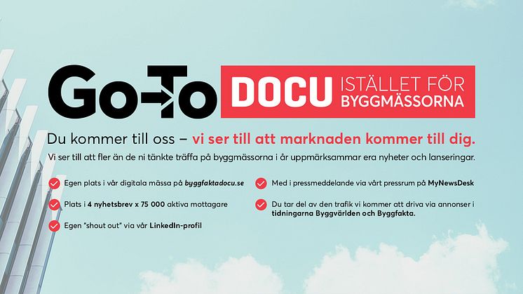 4. Ditt företag och länk till er plats i det digitala mässkonceptet finns med då vi marknadsför "Go-To DOCU ISTÄLLET FÖR BYGGMÄSSORNA" via pressmeddelanden och i vårt pressrum på Mynewsdesk.