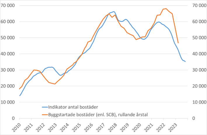 Byggstartsindikator antal bostäder och antalet byggstartade bostäder enl. SCB (rullande årstal)