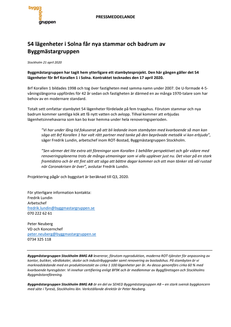 Brf Korallen 1 har givit Byggmästargruppen Stockholm uppdraget att stambyta 54 lägenheter på Ankdammsgatan i Solna. Projektet kommer att genomföras med kvarboende och beräknas igångsättas under Q3, 2020.