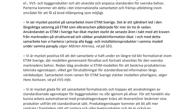 – Vi ser mycket positivt på samarbetet inom ETIM Sverige. Det är ett självklart led i den långsiktiga satsning på ETIM som elbranschen påbörjade för mer än tio år sedan. Användandet av ETIM i Sverige har ökat mycket starkt de senaste åren i takt med att kraven från marknaden på strukturerad och sökbar produktinformation ökat. I och med detta samarbete kan vi hantera i princip alla bygg- och installationsprodukter i samma modell under samma paraply säger Mårten Alrenius, vd på SEG.