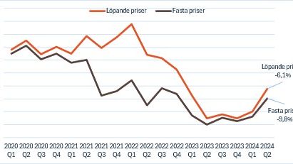 Norra Sverige visade i sin tur på en jämförbar utveckling med Stockholm under första kvartalet men en något mindre nedgång under andra kvartalet med 6,8 procent, mätt i fasta priser och för jämförbara enheter. Sett över rullande 12 månader ser dock utvecklingen fortsatt bättre ut i Stockholm och är därför den regionen som haft lägst nedgång över de senaste 12 månaderna.