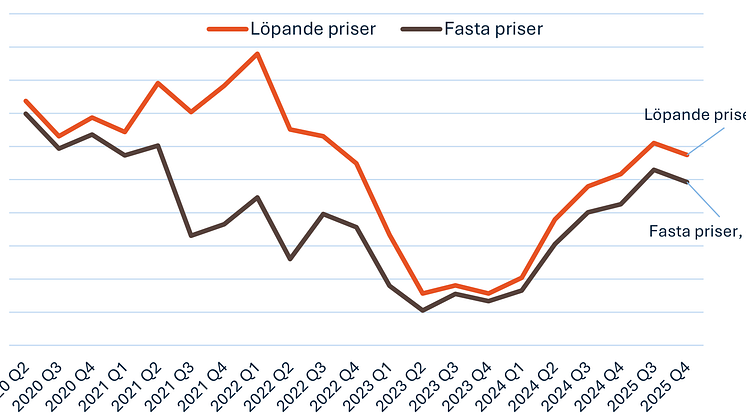 När hänsyn tas till prisutvecklingen, det vill säga mätt i fasta priser, blir bilden dock mer dämpad. Den volymjusterade utvecklingen visar en nedgång med 0,4 procent för kvartalet som helhet.