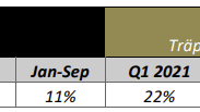 Av de stora varugrupperna är det träprodukter som har haft den starkaste utvecklingen. Under årets tredje kvartal uppgick försäljningstillväxten till 39 procent. En betydande del av försäljningsutvecklingen på träprodukter kan hänföras till prisökningar, vilket delvis är en följd av materialbrist tidigare i år.