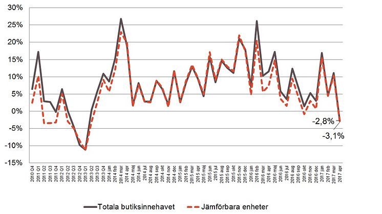 En bidragande orsak till nedgången i april tillskrivs det kalla vädret samt att påsken i år inföll i april jämfört med mars förra året, vilket inneburit tre färre försäljningsdagar i år.